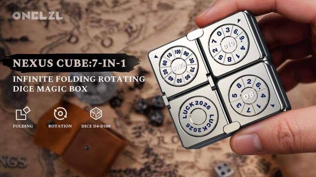 Nexus Cube folds, flips, and rotates into a full RPG dice set from D4 all the way to D100, all tucked inside eight interconnected micro cubes wrapped in a metal sleeve.